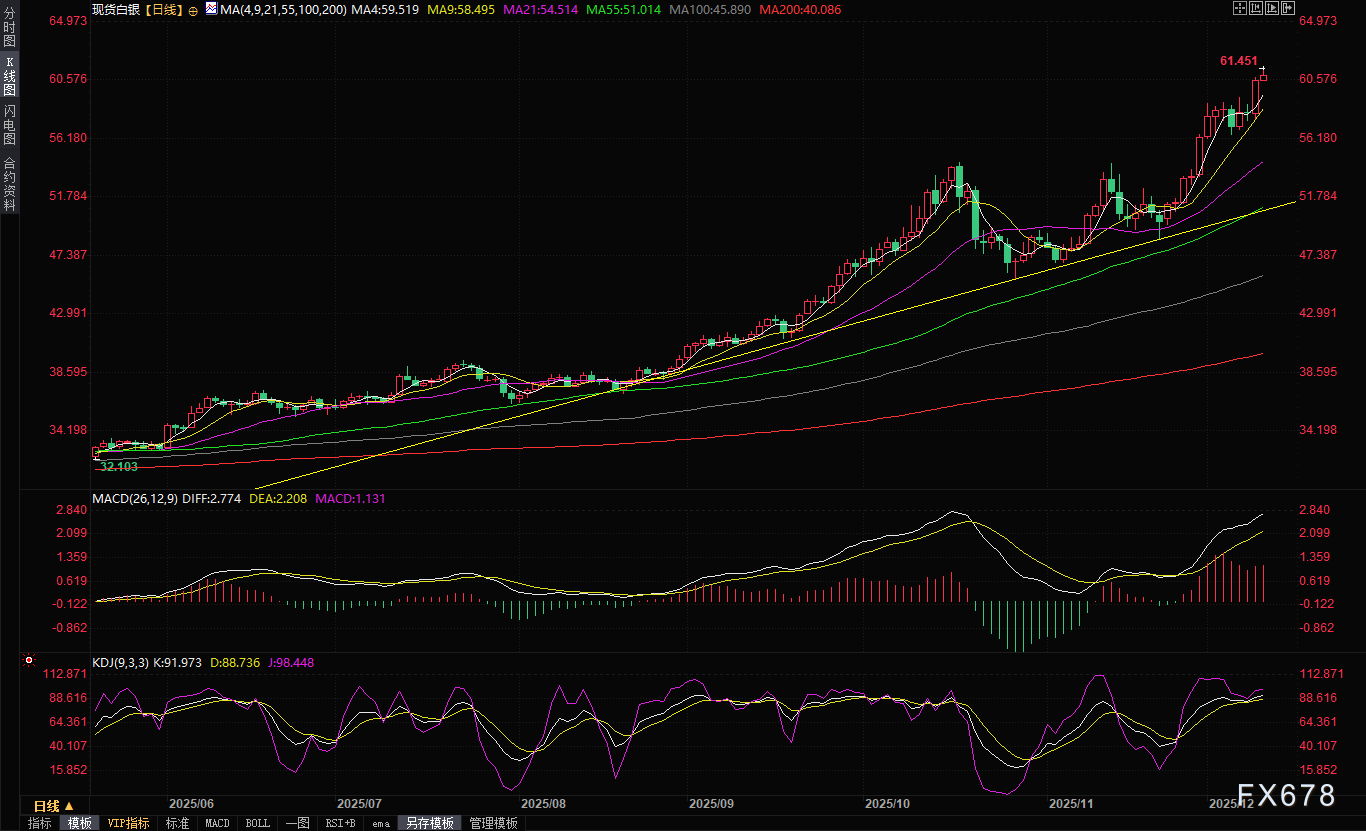 汇通财经APP讯——近期白银价格如火箭般蹿升,周二(12月9日)一举突破60美元/盎司大关,最高触及60.81美元,单日涨幅超过4%,年内累计涨幅已超过100%。周三(12月10日)现货白银延续涨势,一度刷新历史高点至61.45美元/盎司,正式宣告白银进入“60美元时代”。与此同时,金银比快速下行至68.6,创下2021年7月以来最低,意味着白银正在以远超黄金的速度狂奔,白银正在上演史诗级别的独立牛市。